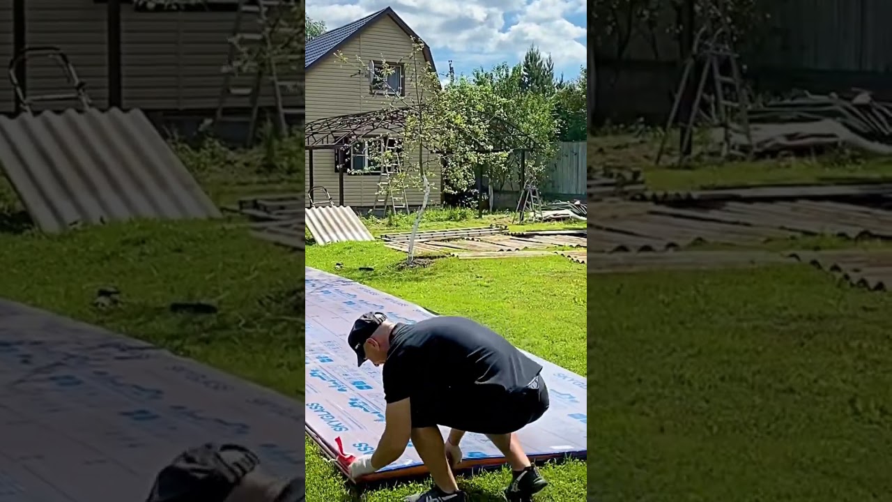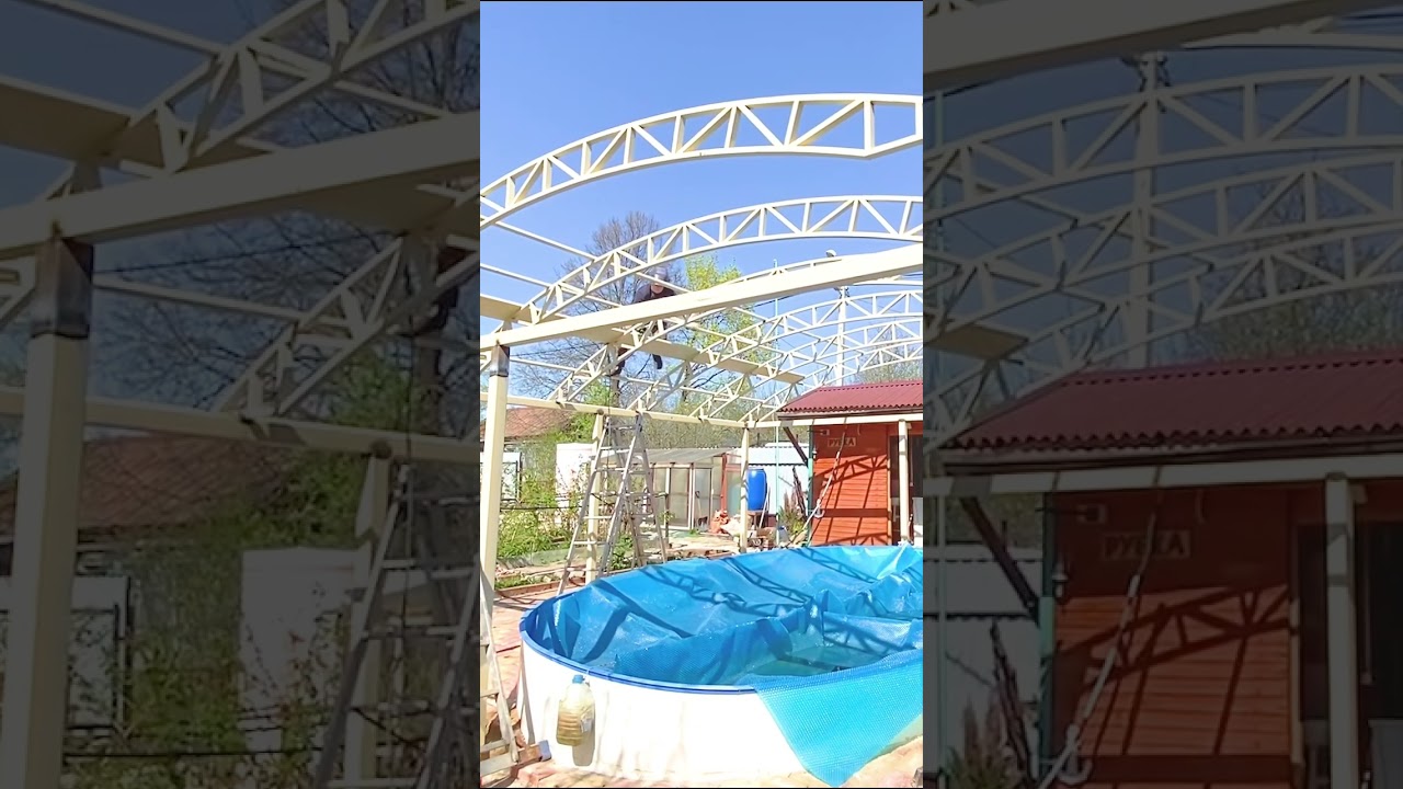 Приступили к сборке очередного комплекта навеса из поликарбоната с необычными стропильными фермами